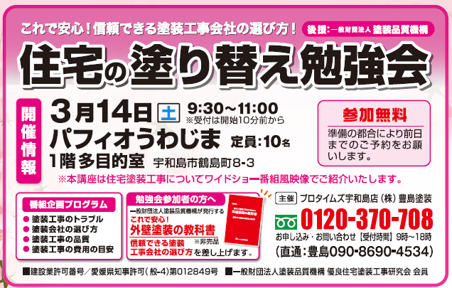 【3月14日(土)パフィオうわじま1階多目的室】住宅塗り替え勉強会のお知らせ