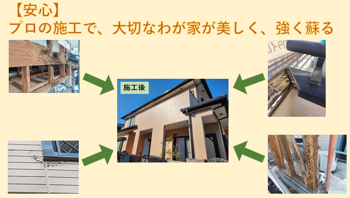 「今すぐ直すべき緊急箇所」と「まだメンテナンスを待てる箇所」をプロの目で見極めることで、無駄な工事や不適切な費用を徹底的に省き、あなたのお住まいに最も価値のある修繕プランをご提案します。