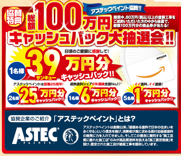 キャンペーンの内容は、80万円(税込)以上の塗装工事をご成約いただいた方の中から抽選で総額100万円分の商品券をプレゼントさせていただきます!!