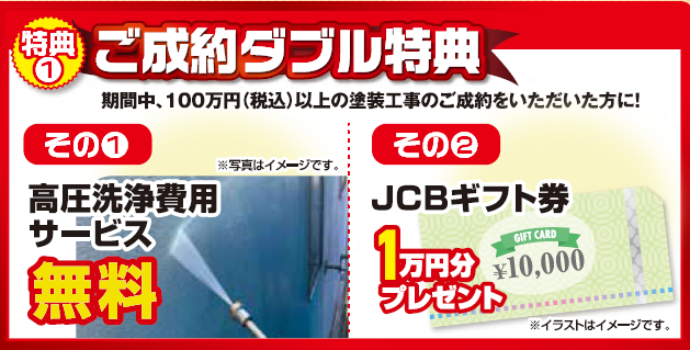 さらに、ご成約ダブル特典としまして【高圧洗浄費用サービス・JCBギフト商品券1万円分】もプレゼントいたします!!
